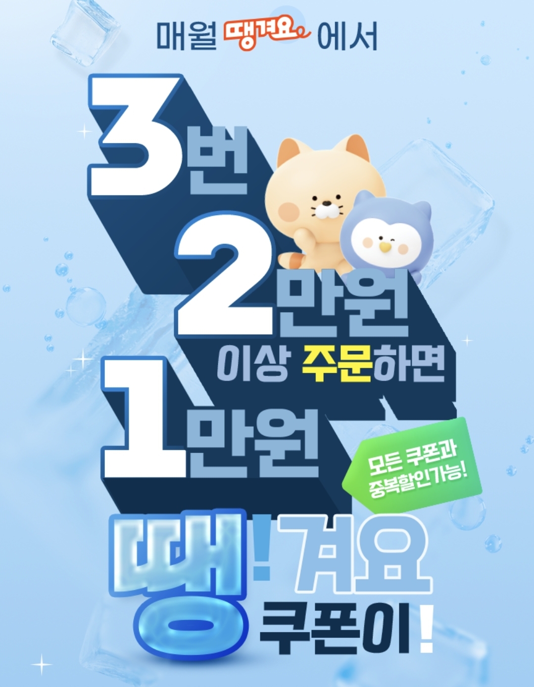 - 한 달 내 2만 원 이상 주문 3회 달성 시 1만 원 쿠폰 발급